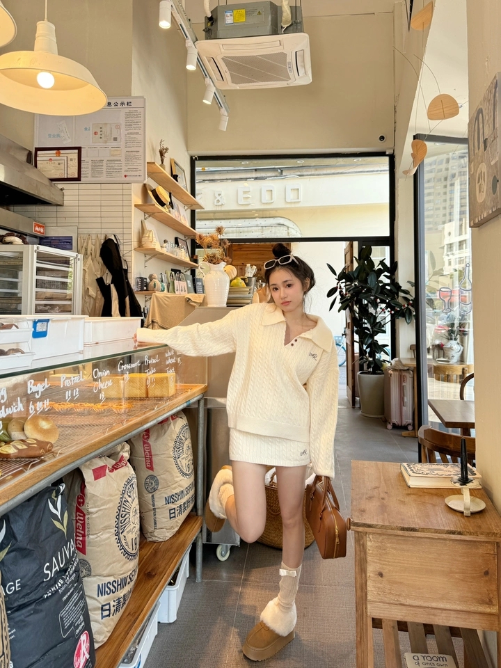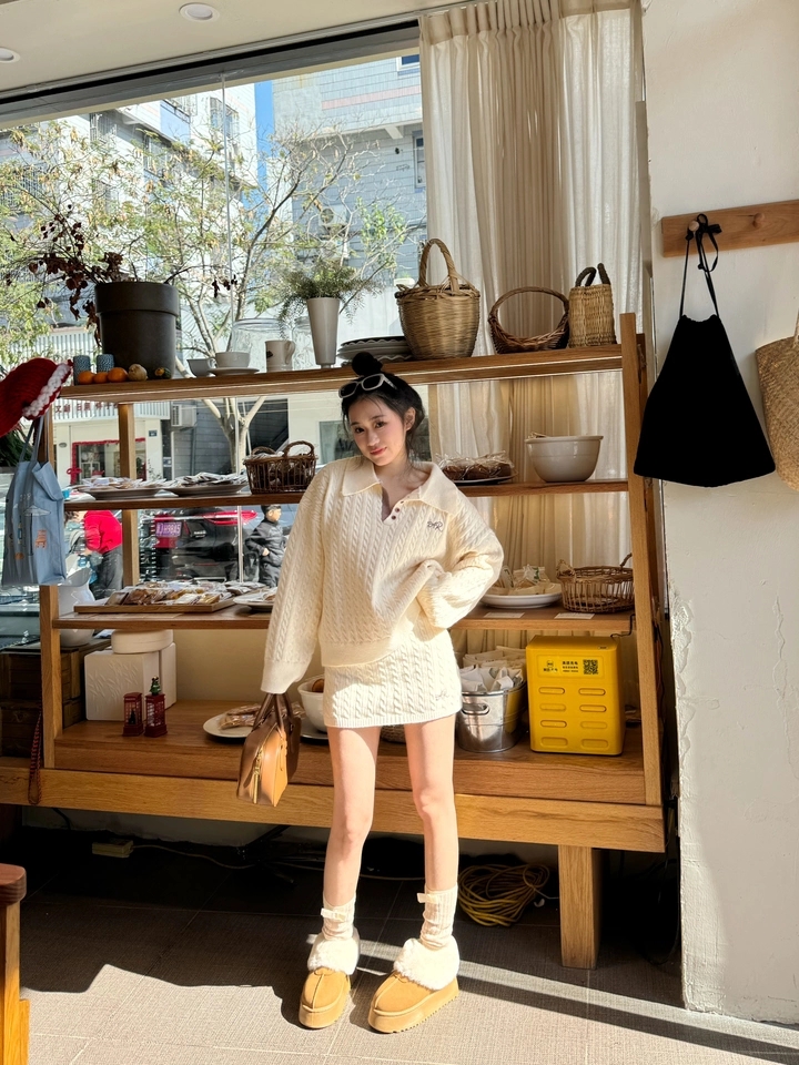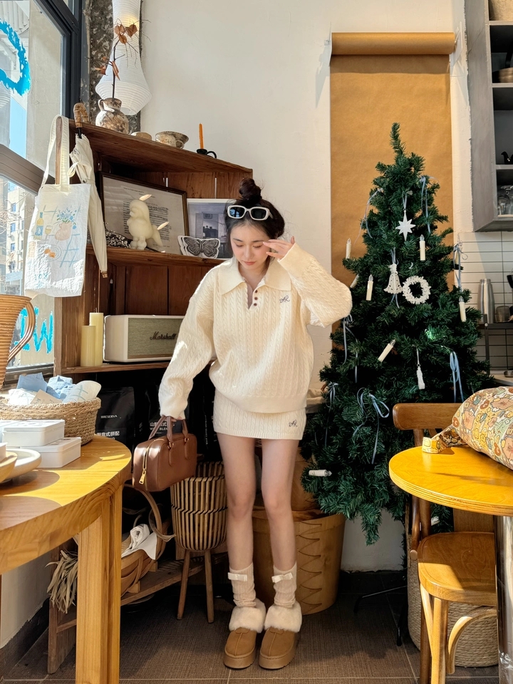 邱肉瑶 学院风麻花纹理长袖针织毛衣女春季新款美式慵懒风套装